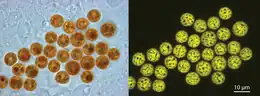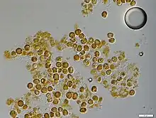 The coccoid cell is surrounded by a cellulosic, usually smooth cell wall that contains large-molecular-weight proteins and glycoproteins.[38][71] Cell walls grow thicker in culture than in hospite.[7] The cell membrane (plasmalemma) is located beneath the cell wall, yet little is known about its composition and function in terms of the regulation of trans-membrane transport of metabolites. During karyokinesis and cytokinesis, the cell wall remains intact until the mastigotes escape the mother cell. In culture, the discarded walls accumulate at the bottom of the culture vessel. It is not known what becomes of the walls from divided cells in hospite.[72] One species, S. pilosum, possesses tufts of hair-like projections from the cell wall; this is the only known surface characteristic used to diagnose a species in the genus.