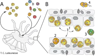 - ↑ Wakefield, Timothy S.; Kempf, Stephen C. (2001). "Development of host- and symbiont-specific monoclonal antibodies and confirmation of the origin of the symbiosome membrane in a cnidarian-dinoflagellate symbiosis". The Biological Bulletin. 200 (2): 127–43. doi:10.2307/1543306. JSTOR 1543306. PMID 11341574. S2CID 21833840.