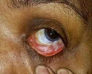 A symblepharon is a partial or complete adhesion of the palpebral conjunctiva of the eyelid to the bulbar conjunctiva of the eyeball. It results either from disease (conjunctival sequelae of trachoma) or trauma. Cicatricial pemphigoid[1] and, in severe cases, rosacea may cause symblepharon. It is rarely congenital. Its treatment is symblepharectomy.