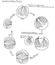 Unlike other dinoflagellates, Syndinium does not possess the conventional dinokaryon or the associated process of dinomitosis. Instead, Syndinium possess fewer but larger chromosomes than most dinoflagellates, as few as 4 compared to the typical 20 plus.[6] Syndinium are notable for their mitotic nuclear division mechanisms involving nuclear membrane attached kinetochores and associated V-shaped chromosomes pushed away from each other by axially aligned microtubules.[7] This method of nuclear division, while not altogether rare within dinoflagellates, were first studied in Syndinium.