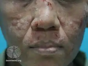 In those without HIV infection, the lungs, liver, and mouth are usually affected, with systemic infection rarely occurring.[2] The skin bumps are also often smooth.[2] The disease tends to present differently in those with HIV infection; they are more likely to experience widespread infection.[2] Their skin bumps however, are usually dented in the centre and can appear similar to molluscum contagiosum.[2][4]