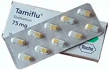 - ↑ Ward P, Small I, Smith J, Suter P, Dutkowski R (February 2005). "Oseltamivir (Tamiflu) and its potential for use in the event of an influenza pandemic". The Journal of Antimicrobial Chemotherapy. 55 Suppl 1: i5–i21. doi:10.1093/jac/dki018. PMID 15709056.