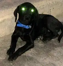 Although human eyes lack a tapetum lucidum, they still exhibit a weak reflection from the choroid, as can be seen in photography with the red-eye effect and with near-infrared eyeshine.[17][18] Another effect in humans and other animals that may resemble eyeshine is leukocoria, which is a white shine indicative of abnormalities such as cataracts and cancers.