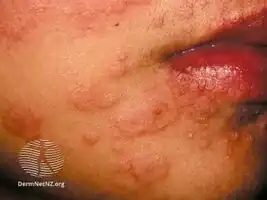 • Target lesions are the typical lesions of erythema multiforme, in which a vesicle is surrounded by an often hemorrhagic maculopapule. Erythema multiforme is often self-limited, of acute onset, resolves in three to six weeks, and has a cyclical pattern. Its lesions are multiform (polymorphous) and include macules, papules, vesicles, and bullae.