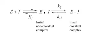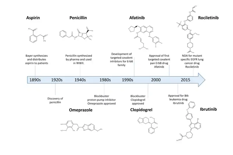 - ↑ Bauer RA (September 2015). "Covalent inhibitors in drug discovery: from accidental discoveries to avoided liabilities and designed therapies". Drug Discovery Today. 20 (9): 1061–1073. doi:10.1016/j.drudis.2015.05.005. PMID 26002380.