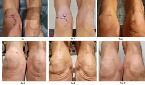 Typical locations of arthroscopic surgery incisions in a knee joint following surgery for a tear in the meniscus