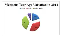 In 2008 the U.S Department of Health and Human Services reported a combined total of 2,295 discharges for the principal diagnosis of tear of lateral cartilage/meniscus (836.0), tear of medial cartilage/meniscus (836.1), and tear of cartilage/meniscus (836.2). Females had a total of 53.49% discharges, while males had 45.72%. Individuals between the ages of 45 and 68 had an average of 31.73% discharges followed by age group 65–84, with 28.82%. The average length of stay for a patient diagnosed with torn menisci was 2.7 days for males and 3.7 days for females. There was a report of 6,941 hospital discharges for knee repair. Individuals between age 18 and 44 were among the highest with 37.37% total of discharges, followed by the age group 45–64, with a percentage of 36.34%. Males had a slightly higher number of discharges (50.78%) than females (48.66%). The average length of stay for both male and female patients in a hospital setting was 3.1.[59]
