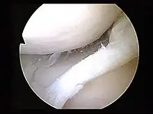 A tear of the medial meniscus[2] can occur as part of the unhappy triad, together with a tear of the anterior cruciate ligament and medial collateral ligament.
