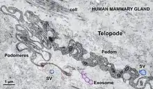 Professor Laurențiu M. Popescu's group from Bucharest, Romania described a new type of cell. Popescu coined the terms telocytes (TC) for these cells, and telopodes (Tp)[2] for their extremely long but thin prolongations[2][3][4][5][6][7][8] in order to prevent further confusion with other interstitial (stromal) cells (e.g., fibroblast, fibroblast-like cells, myofibroblast, mesenchymal cells). Telopodes present an alternation of thin segments, podomeres (with caliber mostly under 200 nm, below the resolving power of light microscopy) and dilated segments, podoms, which accommodate mitochondria, (rough) endoplasmic reticulum and caveolae - the so-called "Ca2+ uptake/release units". The concept of TC was promptly adopted by other laboratories, as well.[9][10][11][12][13][14][15][16][17][18][19]