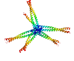 Tetherin is a type 2 integral membrane protein, with the N-terminus in the cytoplasm, one membrane spanning domain, and a C-terminus modified by the addition of a glycosyl-phosphatidylinositol (gpi) anchor.[16] The transmembrane of tetherin is predicted to be a single alpha helix. The ectodomain consists of alpha helical coiled-coil region where the coils are slightly spread apart.[17] Although Tetherin is localized to the lipid rafts on the surface of the cells, they are endocytosed to be sorted through TGN by clathrin-dependent pathway. This is mediated by AP2 binding to the dual-tyrosine motif located in the cytosolic domain of tetherin.[5] When the virion buds from the surface of the cell, one of the tetherin membrane domains is in the new viral membrane, the other remains in the plasma membrane, tethering the virion to the cell. It is antagonized by the viral protein Vpu[18] which is thought to work by targeting tetherin for degradation via the β-TrCP2 dependent pathway.[19][20]