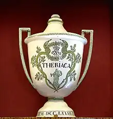 Theriac or theriaca is a medical concoction originally labelled by the Greeks in the 1st century AD and widely adopted in the ancient world as far away as Persia, China and India via the trading links of the Silk Route.[2] It was an alexipharmic, or antidote for a variety of poisons and diseases. It was also considered a panacea,[3] a term for which it could be used interchangeably: in the 16th century Adam Lonicer wrote that garlic was the rustic's theriac or Heal-All.[4]