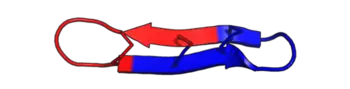 θ-defensins are cyclic peptides of 18 amino acids (~2 kDa), possessing antimicrobial activity against a range of Gram-positive and Gram-negative bacteria, fungi, and some retroviruses.[4][5][6][7] They consist of a pair of antiparallel β-sheets linked by three disulfide bonds arranged as a ladder along the sheets to form an extremely stable structure. Additionally, the peptides may self-associate into trimers.[8]