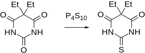 It is of note that although the drug can be prepared by the above route (cf e.g. thialbarbital), reaction of barbital with phosphorus pentasulfide constitutes an alternative route to thiobarbital.