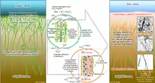 Thioploca genus can accumulate nitrate and use it in the dissimilatory nitrate reduction to ammonium (DNRA) pathway.[26][17][19][3] To obtain nitrate they perform a vertical migration. Sheaths of Thioploca spp. are considered a compatible niche for the growth of anammox bacteria, due to the ability of Thioploca spp. to perform DNRA.[17] They can also perform nitrite reduction and show positive taxis towards nitrite.[26] The dissimilatory nitrate reduction is involved also in the oxidation of sulphide that leads to a higher accumulation of elemental sulphur. Higher concentrations of nitrate increase the fixation of carbon dioxide (CO2), although they can also uptake nitrate when its low environmental concentrations are low.[17]