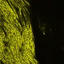 Thioploca are defined by their filamentous morphology, aggregated into bundles enclosed in a polysaccharide sheath, with either a parallel or braided appearance.[10][11] These bundles can reach several cm in length, making them easy to recognise.[12] Occasionally they are also found as free-living trichomes, morphologically similar to the genus Beggiatoa. Thioploca are often mistaken for Beggiatoa, which are close phylogenetic relatives with similar metabolic strategies.[13]