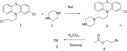 The alkylation of 2-chloro-10-(3-chloropropyl)phenothiazine [2765-59-5] (1) with Piperazine (2) gives N-Desmethylprochlorperazine [40323-85-1] (3). Further alkylation with 2-Bromoethyl acetate [927-68-4] (4) gives Thiopropazate (5).