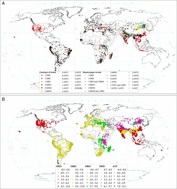 - ↑ Stenseth, Nils Chr; Atshabar, Bakyt B; Begon, Mike; Belmain, Steven R; Bertherat, Eric; Carniel, Elisabeth; Gage, Kenneth L; Leirs, Herwig; Rahalison, Lila (January 2008). "Plague: Past, Present, and Future". PLOS Medicine. 5 (1): e3. doi:10.1371/journal.pmed.0050003. ISSN 1549-1277. PMC 2194748. PMID 18198939.