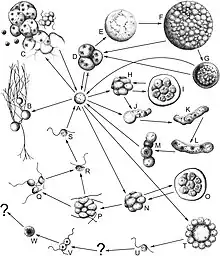 The life cycle of thraustochytrids is generally complicated, differing from genus to genus, and typically consisting of multiple stages of cell types such as zoosporangia, multinucleated cells, mononucleated cells, and amoeboid cells.[24][70][25]