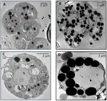 - ↑ Simionato, Diana; Block, Maryse A.; La Rocca, Nicoletta; Jouhet, Juliette; Maréchal, Eric; Finazzi, Giovanni; Morosinotto, Tomas (2013). "The Response of Nannochloropsis gaditana to Nitrogen Starvation Includes De Novo Biosynthesis of Triacylglycerols, a Decrease of Chloroplast Galactolipids, and Reorganization of the Photosynthetic Apparatus". Eukaryotic Cell. 12 (5): 665–676. doi:10.1128/EC.00363-12. ISSN 1535-9778. PMC 3647774. PMID 23457191.