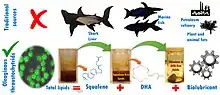 Squalene (a precursor to sterols) is used to improved human health as a drug delivery system, and a moisturizing agent which is typically derived from shark liver oil.[10][31][32] With an increase in demand for squalene over time, sharks are faced with a major decline in population size. Thus, an incentive for a new form of squalene production was generated, and Aurantiochytrium seems to be a viable solution to this problem.[120][121][122][123]