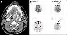 An ectopic thyroid, also called accessory thyroid gland, is a form of thyroid dysgenesis in which an entire or parts of the thyroid located in another part of the body than what is the usual case. A completely ectopic thyroid gland may be located anywhere along the path of the descent of the thyroid during its embryological development, although it is most commonly located at the base of the tongue, just posterior to the foramen cecum of the tongue. In this location, an aberrant or ectopic thyroid gland is known as a lingual thyroid.[3] If the thyroid fails to descend to even higher degree, then the resulting final resting point of the thyroid gland may be high in the neck, such as just below the hyoid bone.[3] Parts of ectopic thyroid tissue ("accessory thyroid tissue") can also occur, and arises from remnants of the thyroglossal duct, and may appear anywhere along its original length.[3] Accessory thyroid tissue may be functional, but is generally insufficient for normal function if the main thyroid gland is entirely removed.[3]