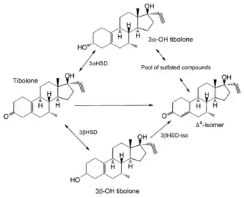 Metabolites | • Δ4-Tibolone[7] • 3α-Hydroxytibolone[7] • 3β-Hydroxytibolone[7] • Sulfate conjugates[8] |