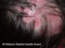 Tinea capitis, also known as ringworm of the scalp, is a type of fungal infection of the skin of the scalp.[2][3] The clinical presentation is typically single or multiple patches of hair loss, sometimes with a 'black dot' pattern (often with broken-off hairs), that may be accompanied by inflammation, scaling, pustules, and itching.