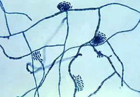 Tinea nigra is caused by the fungus formerly classified as Cladosporium werneckii, but more recently classified as Hortaea werneckii.[4] The causative organism has also been described as Phaeoannellomyces werneckii.[5] Tinea nigra is extremely superficial and can be removed from the skin by forceful scraping. It tends to appear in areas where eccrine sweat glands are highly concentrated. Infections generally start to appear on the skin around 2–7 weeks post inoculation.
