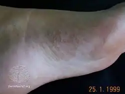 Tinea nigra is a fungal infection of the top layer of skin.[1] It typically presents as a single 1 to 5 cm dark brown or black, non-scaly, flat, painless patch on the palms of the hand or soles of the foot.[1] There is little or no skin inflammation.[1] Typically it occurs in people who are otherwise healthy.[1]