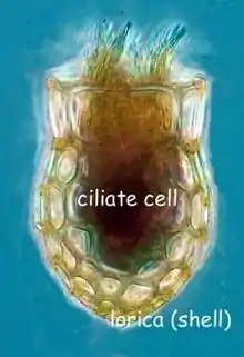 Tintinnids are ciliates of the choreotrich order Tintinnida, distinguished by vase-shaped shells, the name deriving from a Latin source meaning a small tinkling bell, that are called loricae, which are mostly protein but may incorporate minute pieces of minerals.[1]