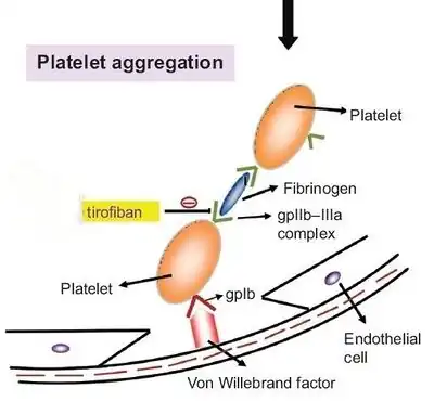 Tirofiban, sold under the brand name Aggrastat, is an antiplatelet medication used to treat unstable angina or non-ST-segment-elevation MI (NSTEMI).[1] It is used together with other medications.[1] It is given by injection into a vein.[1] Effects begin rapidly and last up to 8 hours.[1]