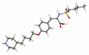 Tirofiban is a synthetic, non-peptide inhibitor of the interaction of fibrinogen with the integrin glycoprotein (GP) IIb/IIIa on human platelets. The Merck chemistry team of George Hartman, Melissa Egbertson and Wasyl Halczenko developed tirofiban from a lead compound discovered in focused screening of small molecule replacements of the key arginine-glycine-aspartic acid (Arg-Gly-Asp) subunit of fibrinogen. Computation of the distance between the charged Arg and Asp sites in fibrinogen provided guidance leading to directed screening success. Tirofiban constitutes an antithrombotic, specifically an inhibitor of platelet aggregation.