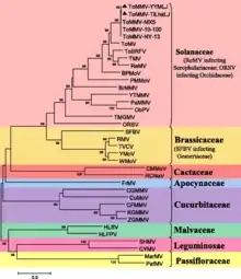 Tobamovirus RNA-dependent RNA polymerases are homologous with bromoviruses, ilarviruses, tobraviruses, and the carnation mottle virus.[1]