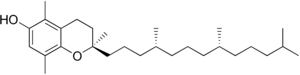 There are three stereocenters in α-tocopherol, so this is a chiral molecule.[10] The eight stereoisomers of α-tocopherol differ in the arrangement of groups around these stereocenters. In the image of RRR-α-tocopherol below, all three stereocenters are in the R form. However, if the middle of the three stereocenters were changed (so the hydrogen was now pointing down and the methyl group pointing up), this would become the structure of RSR-α-tocopherol. These stereoisomers also may be named in an alternative older nomenclature, where the stereocenters are either in the d or l form.[11]