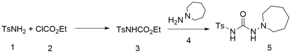 para-Toluenesulfonamide is converted to its carbamate with ethyl chloroformate in the presence of a base. Heating that intermediate with 1-amino-azepane leads to the displacement of the ethoxy group and the formation of tolazemide:[4]