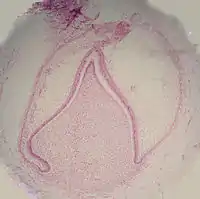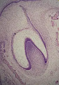 Histologic slide of tooth in late bell stage. Note disintegration of dental lamina at top.