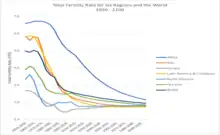 The chart shows that the decline in TFR since the 1960s has occurred in every region of the world and that the global TFR is projected to continue to decline for the remainder of this century.[28]
