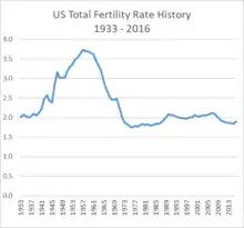 The total fertility rate in the United States after World War II peaked at about 3.8 children per woman in the late 1950s, dropped to below replacement in the early 70s, and by 1999 was at 2 children.[46] Currently, the fertility is below replacement among those native born, and above replacement among immigrant families, most of whom come to the United States from countries with higher fertility. However, the fertility rate of immigrants to the United States has been found to decrease sharply in the second generation, correlating with improved education and income.[47] In 2021, U.S. TFR was 1.8, ranging between over 2 in some states and under 1.6 in others.[15]