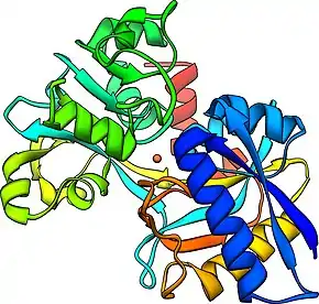 ![]() The transferrin protein binds free iron and transports it in the blood. | |