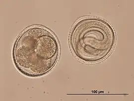 Eggs are deposited in feces of dogs, becoming infectious after 2–4 weeks.[8] Dogs ingest infectious eggs, allowing the eggs to hatch and the larval form of the parasite to penetrate through the gut wall. In dogs under 3 months of age, the larvae hatch in the small intestine, get into the bloodstream, migrate through the liver, and enter the lungs. Once in the lungs, the larvae crawl up the trachea. The larvae are then coughed up and swallowed, leading back down to the small intestine, where they mature to adulthood. This process is called tracheal migration. In dogs older than 3 months of age, the larvae hatch in the small intestine and enter the bloodstream, where they are carried to somatic sites throughout the body (muscles, kidney, mammary glands, etc.) where they become encysted second stage larvae. This process is called somatic migration. At the height of pregnancy, the encysted eggs in an infected female dog will migrate from the mother to the developing fetus, where they will reside in the liver. After parturition, the larvae migrate from the pup's liver to the lungs to undergo tracheal migration. Alternatively, the migrating larvae in the mother may encyst within the mammary glands, becoming active during lactation and passing directly to the nursing puppy via the milk. Larvae transmitted in this manner do not migrate once they are within the small intestine of the puppy; they will develop directly into the adult stage in the small intestine.[3] Once infected, a female dog will usually harbor sufficient larvae to subsequently infect all of her litters, even if she never again encounters an infection. A certain amount of the female dog's dormant larvae penetrate into the intestinal lumen, where molting into adulthood takes place again, thus leading to a new release of eggs containing L1 larvae.[8]