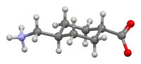 Tranexamic acid is a synthetic analog of the amino acid lysine. It serves as an antifibrinolytic by reversibly binding four to five lysine receptor sites on plasminogen. This reduces conversion of plasminogen to plasmin, preventing fibrin degradation and preserving the framework of fibrin's matrix structure.[21] Tranexamic acid has roughly eight times the antifibrinolytic activity of an older analogue, ε-aminocaproic acid. Tranexamic acid also directly inhibits the activity of plasmin with weak potency (IC50 = 87 mM),[53] and it can block the active-site of urokinase plasminogen activator (uPA) with high specificity (Ki = 2 mM) among all the serine proteases.[54]