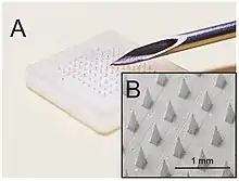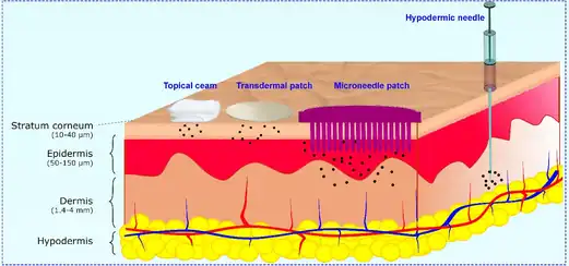 The microneedle patch (MNPs) is a type of transdermal patch that retains the advantages, but reduces the disadvantages, of basic transdermal patches. Embedding as many as 102-104 needles per square centimetre of patch, encapsulated or coated with intended drug, MNPs can easily pass skin tissue known as the stratum corneum that is roughly 20 μm in thickness, allowing up to the size macromolecule to pass.[6] The development of MNPs is mainly because selective transdermal patch can deliver smaller size or micronized molecules such as nicotine and birth control that easily diffuse and penetrate the skin, but lack in delivering macro or large size molecules. The 100-1000 μm needles spread across the patch, making sure patients will not feel any discomfort from the patch. There are two types of needles used in MNPs, the first one is non-water-soluble needles made out of metal, ceramic, or polymer, and the second one is water-soluble needles made out of saccharides or soluble polymers.[6]