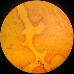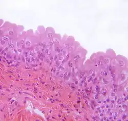 The appearance of transitional epithelium differs according to its cell layer. Cells of the basal layer are cuboidal (cube-shaped), or columnar (column-shaped), while the cells of the superficial layer vary in appearance depending on the degree of distension.[2] These cells appear to be cuboidal with a domed apex when the organ or the tube in which they reside is not stretched. When the organ or tube is stretched (such as when the bladder is filled with urine), the tissue compresses and the cells become stretched. When this happens, the cells flatten, and they appear to be squamous and irregular.