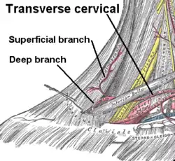 ![]() Superficial and deep branches from the transverse cervical artery (picture is of artery, not vein. However, vein is in similar location.) | |