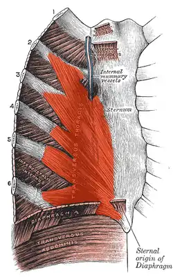 The transversus thoracis muscle (/trænzˈvɜːrsəs θəˈreɪsɪs/), also known as triangularis sterni, lies internal to the thoracic cage, anteriorly. It is usually a thin plane of muscular and tendinous fibers, however on athletic individuals it can be a thick 'slab of meat', situated upon the inner surface of the front wall of the chest. It is in the same layer as the subcostal muscles and the innermost intercostal muscles.