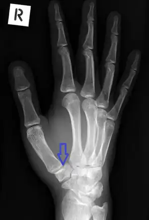 The typically result from forces transmitted through the thumb, or being pulled upon by the transverse carpal ligament.[3] Types include body, trapezial ridge, and fracture dislocations.[3] Diagnosis is generally by X-ray or CT scan.[3]
