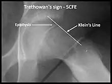 Trethowan's sign is when Klein's line does not intersect the lateral part of the superior femoral epiphysis on an AP radiograph of the pelvis.[1]
