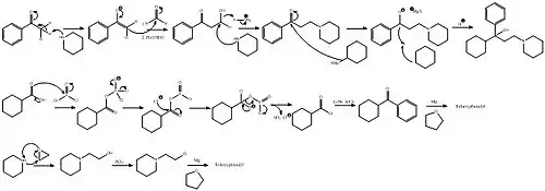 In the first way, the initial 2-(1-piperidino)propiophenone is synthesized in turn by the aminomethylation of acetophenone using paraformaldehyde and piperidine in a Mannich reaction. In the second step the 2-(1-piperidino)propiophenone is reacted with cyclohexylmagnesium bromide in a Grignard reaction.[22]