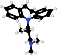 Trimipramine is a very potent antihistamine; it has the third highest affinity for the H1 receptor (Ki = 0.27 nM) after mirtazapine (Ki = 0.14 nM) and doxepin (Ki = 0.24 nM) among the TCAs and tetracyclic antidepressants (TeCAs).[14][32] The TeCA mianserin (Ki = 0.40) and the TCA amitriptyline (Ki = 1.0) are also very potent H1 receptor antagonists,[14][32][33] whereas other TCAs and TeCAs are less potent.[25] These TCAs and TeCAs, including trimipramine, are far more potent than the standard antihistamine diphenhydramine (approximately 800 times for doxepin and 250 times for trimipramine),[34] and are among the most potent antihistamines available.[33][35]