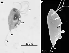 Tritrichomonas is a genus of single celled flagellated parasitic excavates, some of whose species are known to be pathogens of the bovine reproductive tract as well as the intestinal tract of felines.[1]